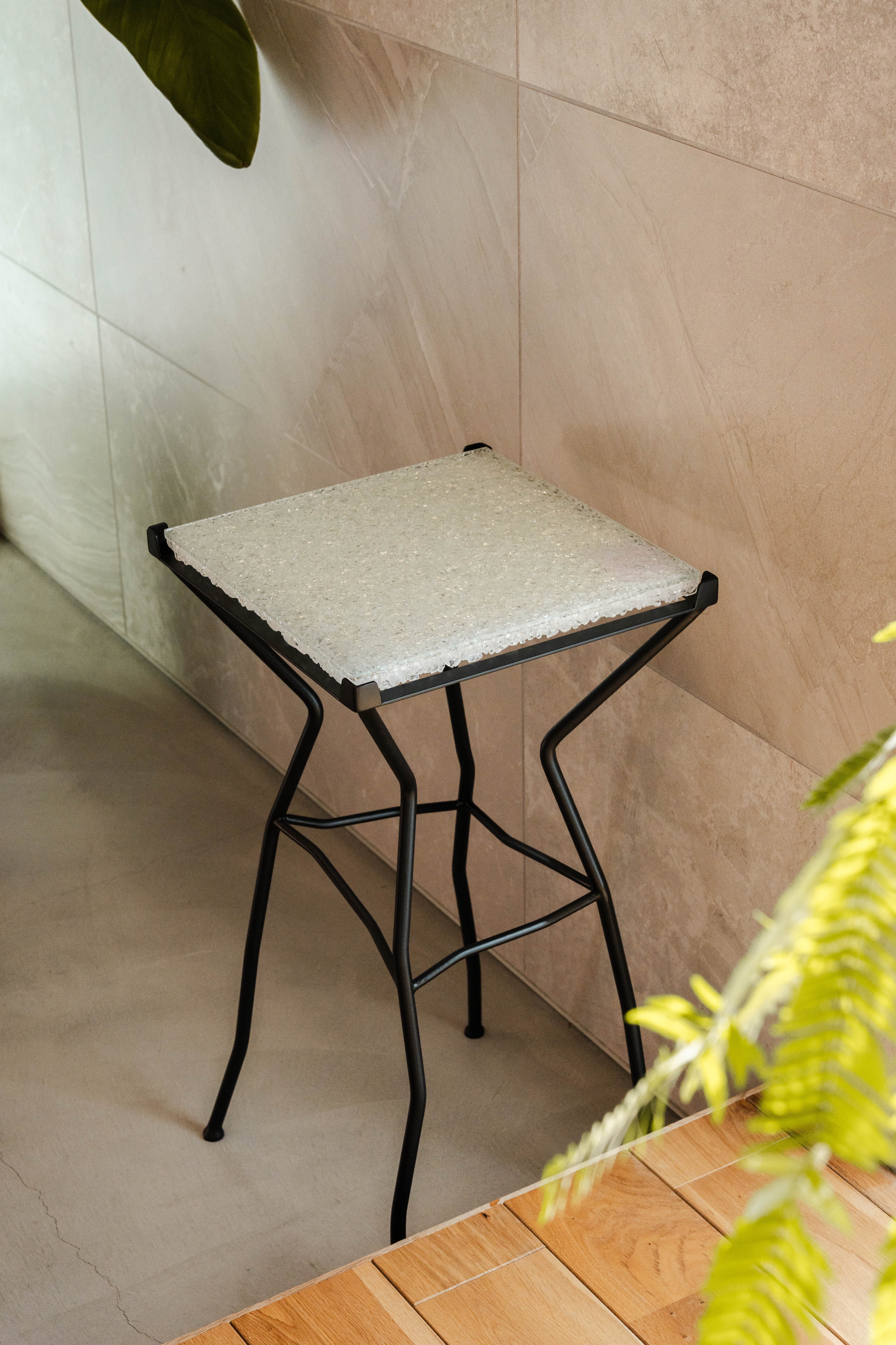 このスツールは、実用性と美しさを兼ね備えており、リビングや玄関先、さらには商業空間でも活躍します。また、透明感のあるグラス素材が、光を反射し、空間を明るく演出します。このスツールは、気軽に移動できる軽さと、しっかりとした安定感が魅力です。